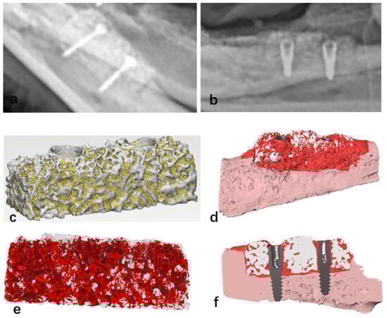 Bone healing image observed between the bioactive glass scaffold and the bottom of the bone defect area (a); bone “integration” image observed between the implant and the bioactive glass scaffold 12 weeks after implant placement (b); micro-CT reconstruction images of bioactive glass scaffolds, where yellow indicates newly formed bone tissue and white represents scaffold materials (c); the stent was modified to be transparent in order to enhance the visibility of the newly formed bone tissue marked in red (e); micro-CT scan reconstruction image of the bioactive glass scaffold with dental implants, where white indicates the scaffold material, dark red signifies new bone tissue, light pink represents autologous alveolar bone tissue, and gray denotes the metallic implant (d,f).