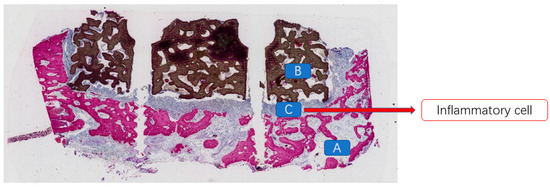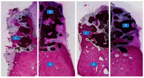Vascular tissues, unmineralized bone, and newly formed mineralized bone observed between the scaffold material and the alveolar bone defect area, as well as within the scaffold material, in the non-exposed specimen. (A: alveolar bone; B: bioceramic scaffold; C: vascular tissues, unmineralized bone, and newly formed mineralized bone).