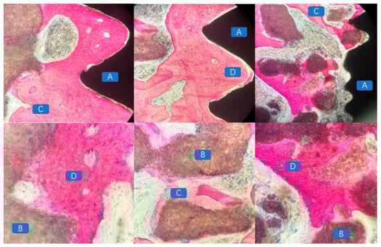Histopathological analysis demonstrating the presence of newly formed bone tissue between the bioactive glass scaffold and the alveolar bone defect area, with a substantial amount of newly formed mineralized bone within the scaffold. Additionally, newly formed vascular and mineralized bone tissues were observed between the implant and the scaffold, indicating signs of “osseointegration”. (A: implant; B: residual tissue degraded by scaffold material; C: new uncalcified bone tissue; D: calcified mature bone tissue).