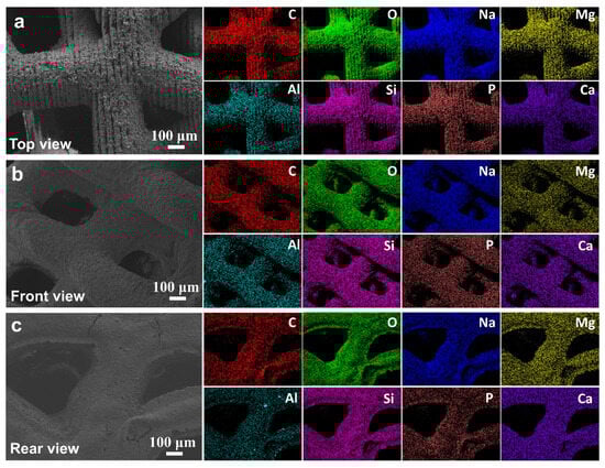 Figure 11 shows the multicolor EDS elemental mapping results, delineating the spatial distribution of C (red), O (green), Na (blue), Mg (yellow), Al (cyan), Si (pink), P (brown), and Ca (purple). The homogeneous dispersion of Si and Ca throughout the scaffold matrix supports the formation of a stable silicate network, while localized Mg and Al enrichment at pore boundaries suggests strategic doping to enhance mechanical strength without compromising bioactivity—a methodology paralleled in Harvard/Wyss Institute’s “compositionally graded scaffolds”. Notably, the absence of elemental segregation implies precise control over the 3D printing parameters (e.g., layer-by-layer deposition temperature, binder saturation). The synergistic integration of multiscale porosity and tailored elemental stoichiometry positions this scaffold as a competitive candidate for load-bearing bone repair, addressing the current limitations of brittleness and slow osseointegration rates observed in conventional bioactive glasses.