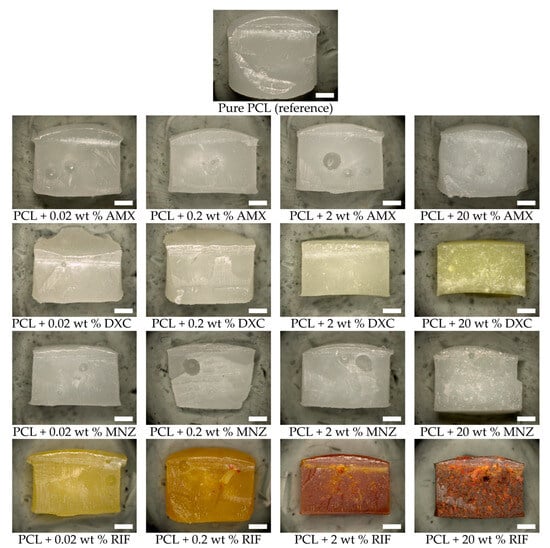 The antibiotics were successfully incorporated into the polymer matrix by stirring them into the molten PCL. The microscopic images obtained using a light microscope demonstrate a homogeneous distribution of the active ingredients throughout the polymer matrix (Figure 1). In small quantities, the antibiotics are fully soluble in the polymer. As the concentration increases, undissolved particles remain, which are distributed homogeneously in the matrix without forming agglomerates. In certain instances, the introduction of the antibiotics resulted in a change in colour. For instance, rifampicin, which is inherently red, resulted in a yellow colouration at low concentrations and an orange or red colouration at higher concentrations. The addition of doxycycline resulted in a yellowish discolouration of the matrix at high concentrations, while amoxicillin led to an increased opacity of the milky-white matrix. An increase in viscosity was observed as the proportion of the active ingredient in the molten mass increased. The addition of the antibiotics, even in high concentrations, had no negative effect on the moulding process or the dimensional stability of the test specimens.