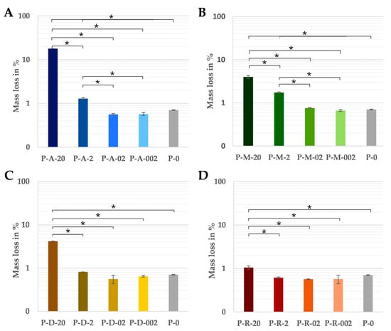 The dry masses of the test specimens before and after incubation showed no significant differences compared to the pure PCL at the two lower concentrations of 0.02 and 0.2 wt%, regardless of the antibiotic. As the absolute amount of antibiotic (0.0142 mg or 0.142 mg) of these samples was within the tolerance of the balance, even the complete dissolution of the antibiotic could not be detected by the change in mass. The greatest mass losses occurred in samples with a content of 20 wt% of the antibiotic (Figure 2). There were also clear differences between the various antibiotics. Of these, the samples with amoxicillin lost the most weight at 17.9% (Figure 2A), the samples loaded with metronidazole (Figure 2B) and doxycycline (Figure 2C)were in the middle range (approximately 4.0%) and the rifampicin variant showed the lowest mass loss at 1.1% (Figure 2D).