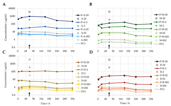 In vitro release profiles of PCL-based DDSs with amoxicillin (A), doxycycline (B), metronidazole (C) and rifampicin (D) in PBS (pH = 7.4) at 37 °C, measured via UV/Vis spectroscopy (n = 3). As a reference, the measured antibiotic equivalent of the pure PCL is given. The non-filled markers indicate the antibiotic concentrations that the pure antibiotics caused when they were simply added into 1 mL of medium, according to their mass fraction in the DDS. The difference in the respective antibiotics concentration (from DDS and the plain antibiotic) at the same mass equivalents reflects the sustained release due to the DDS. The samples utilised for the agar diffusion assay, along with the assays for cellular viability, are indicated by an arrow.