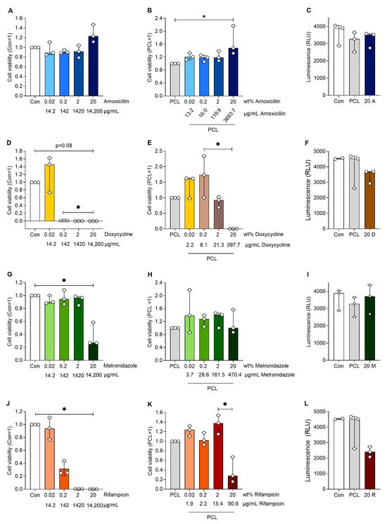 Cell viability of human aortic smooth muscle cells after cultivation with the various plain antibiotics (A,D,G,J) at respective antibiotic mass equivalents compared to the antibiotic proportions in the PCL-based DDS. Furthermore, the cell viability of the human aortic smooth muscle cells are shown after cultivation with a medium loaded with antibiotics (released from the PCL-based DDS) with an increasing wt% of different antibiotics (B,E,H,K). The luminescence of the human aortic smooth muscle cells (C,F,I,L) after cultivation with a preconditioned medium of plain PCL and a medium with 20 wt% mass equivalent antibiotics (14,200 µg/mL) is also shown. Significant differences are indicated by asterisks (p < 0.05).