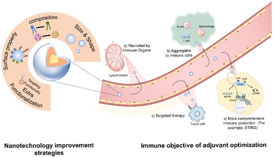 To operationalize these strategies, optimizing nanodelivery system-based adjuvants involves precise control over their size and physicochemical properties, including their elemental composition, solubility, hydrophobicity, mechanical properties, surface functional groups, and charge (Figure 1). By modulating the size and shape of adjuvants, it is possible to target specific immune tissues and cells, thereby achieving tailored immunological outcomes [59]. Optimizing the composition of adjuvants is also critical for enhancing immunostimulatory efficacy. Altering certain components can reduce toxicity, improve antigen–adjuvant binding affinity, and enable sustained antigen release, which prolongs immune activation and strengthens memory responses [60]. Furthermore, modifying the surface charge or introducing functional groups can expand the types of antigen interactions, reduce adjuvant aggregation, and improve storage stability, while enabling targeted delivery to specific immune sites [55]. Incorporating additional functional components can stimulate broader immune responses, facilitate targeting of specific immune cells or tissues, and enhance transmembrane and intracellular delivery of antigens [61].