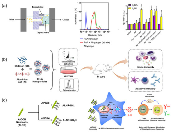Application of nanodelivery systems in Aluminum Salt Adjuvants: (a) Alhydrogel Microflow Nanofabrication: In a study using C57BL/6 mice and the recombinant tuberculosis vaccine antigen ID93, PAA-stabilized nanoalum generated via top-down microfluidization significantly enhanced the Th1-type immune response. The formulation induced high levels of IFN-γ and TNF-producing CD4⁺ T cells, as well as balanced and high-titer IgG1 and IgG2c serum responses. Notably, this effect was achieved without co-administration of TLR4 agonists; Adapted with permission from Ref. [73]. **** p < 0.0001 relative to the antigen alone group as determined by one-way ANOVA with Dunnett’s correction for multiple comparisons. (b) Chitosan-Doped Aluminum Salt: Using ovalbumin (OVA) as the model antigen in C57BL/6 mice, chitosan-coated aluminum nanorods (CH-NPs) elicited stronger antigen-specific IgG2c responses and a more balanced Th1/Th2 cytokine profile compared to conventional formulations. This enhanced immunogenicity was attributed to improved antigen uptake and inflammasome activation driven by the cationic surface of chitosan-alum hybrids; Reprinted with permission from Ref. [76]. Copyright 2018 Elsevier. (c) Surface functionalization of ALNR: In the C57BL/6 mouse model with OVA as the immunogen, cationically modified aluminum oxyhydroxide nanorods (ALNR-NH2) promoted higher antigen-specific humoral responses than pristine or SO3H-modified ALNRs or conventional alum. The adjuvant activity was linked to elevated ROS generation, lysosomal damage, and activation of the NLRP3 inflammasome; Reprinted with permission from Ref. [55]. Copyright 2017 ACS Publications.