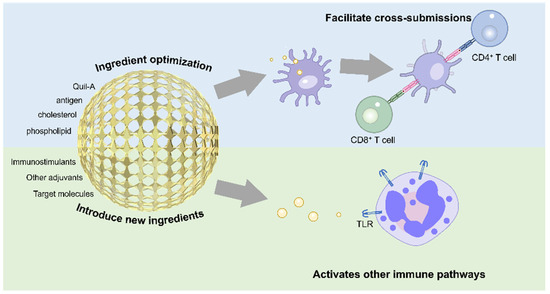 Optimizing and adjusting the components of ISCOMs enhances their stability and safety while boosting their immunomodulatory effect. Exploring the roles of individual Quil A components and their synergistic effects could improve immunostimulants while reducing toxicity. Similarly, altering the properties of ISCOM phospholipids and cholesterol can modify their charge characteristics and structural stability. These adjustments leverage nano-based strategies to refine the structural and functional properties of ISCOMs, tailoring them to achieve the desired adjuvant properties. Future research could explore incorporating lipids with additional functionalities to enhance their immune-stimulating effects, thereby gaining more comprehensive immune protection. These modifications and improvements hold significant promise for advancing ISCOM optimization.