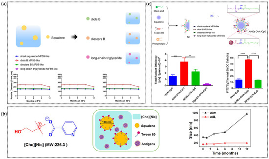 Nano-structural optimization has enhanced MF59’s stability and immunostimulatory performance. Squalene’s oxidative instability necessitates oil-phase modification [151]. Researchers have tested the stability of several potential squalene substitutes after synthesizing MF59 (Figure 4a). Yuan et al. developed squalene–aluminum stabilized emulsions (ASEs) prepared with soybean, peanut, and olive oils with varying oleic/linoleic acid (O/L) ratios. Soybean-based ASEs (O/L ratio = 1:2.75) demonstrated superior long-term stability and charge retention [23]. These emulsions were prepared in a single step using ultrasonication with aluminum hydroxide. Lin et al. created an oil-in-ionic liquid (o/IL) emulsion using choline–nicotinic acid ionic liquid ([Cho][Nic]), squalene, and Tween 80 (Figure 4b). The formulation achieved a 168.6 nm diameter, a PdI of 0.068 and 12-month stability at 25 °C via reduced interfacial tension. Following intranasal mucosal immunization in mice, o/IL significantly enhanced the prolonged retention of the antigen in the nasal cavity and promoted its paracellular transport across the mucosal epithelium. As a result, the secretory IgA titer in mice was 25-times higher than that induced by the bare antigen and 5.8-times higher than that achieved with the commercial MF59-adjuvanted antigen [152]. Wang et al. replaced squalene with vitamin E, yielding lipid droplets (LDs) stable under 120 °C sterilization, underscoring oil-phase optimization’s impact on thermal resilience [153].