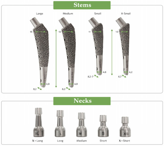 The implant was manufactured using selective laser sintering technology with the subsequent polishing of smooth surfaces. The V@rt canine endoprostheses [63] general view of different sizes is shown in Figure 2.