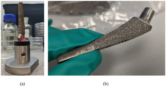 To review the microgeometric features of the sample, scanning electron microscopy (SEM) of the stem implant surface was performed using an EVO MA18 system (Carl Zeiss Microscopy Deutschland GmbH, Oberkochen, Germany) on smooth (Appendix A, Figure A1a–c) and ribbed (Figure A1c) surfaces. The studies were carried out using an Everhart–Thornley secondary electron detector with an extra high tension of 10 kV. The neck surface was examined using a Zeiss StereoDiscovery V.20 stereomicroscope (Carl Zeiss Microscopy Gmbh, Oberkochen, Germany) according to the Abbe scheme. Zeiss ZEN software (Carl Zeiss Microscopy Gmbh, Oberkochen, Germany) was used for image processing (Appendix A, Figure A2). Significant porosity of about 1 mm is shown in Figure A1d, which corresponds to the ribbed surface on the part of the implant Figure 3b that is placed in the femur and is designed to improve fusion. This ribbing (porosity) is only in the superficial zone, the depth of the ribbing is no more than 1 mm.