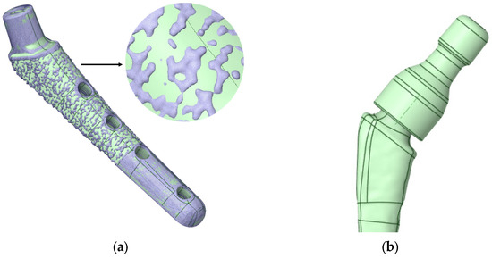 V@RT implants of various sizes. (a) Gray—original geometry after scanning in stl format, green—3D geometry prepared for calculation in stp format; (b) neck on a stem.