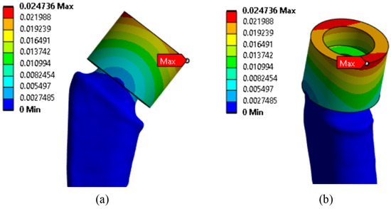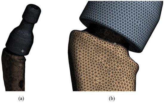 Figure 5a shows the geometry scanned by the micro-CT system and converted for calculation in Gether; as you can see, we have a sufficient match. The ribbed part shown in Figure 5a is intended to improve the fusion of the biological material (bone) with the titanium stem. In this study, uniform adhesion and adhesion of the stem surface immersed in the bone was assumed, so the ribbed part was smoothed (the boundary conditions will be specified in more detail below). However, the influence of the ribbed part on the fusion process and on the occurrence of “micro” stress concentrators are of great interest for further research. Figure 5b shows the neck on the stem.