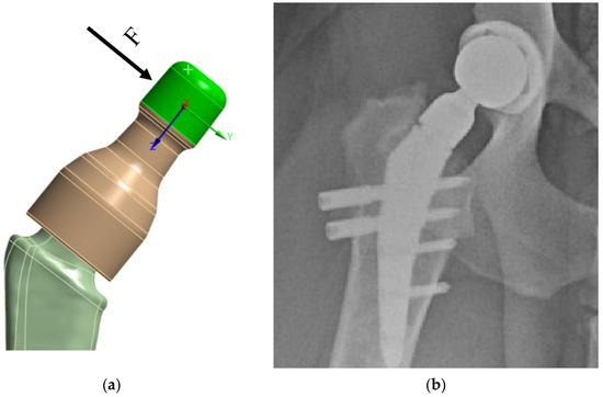 V@rt implants FEM boundary conditions: (a) load on the neck; (b) X-ray image.