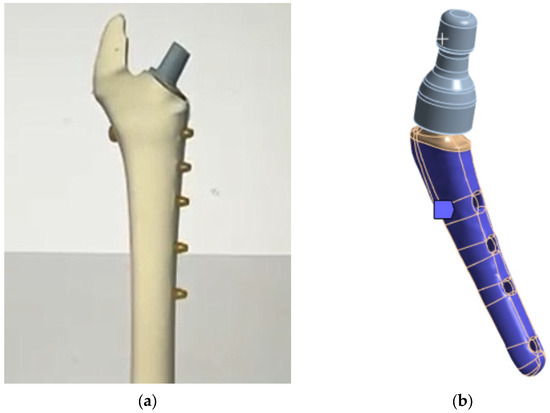 The deformation behavior study of femoral implants for design optimization of medical devices and a more accurate biomimetic correspondence of these artificial structures under the action of physiological loads has been actively developed since the pioneering works [10,11,12,13]. The finite element method (FEM) active development made it possible to model quite complex design options. Thus, Huiskes and Boeklagen [14] presented a numerical shape optimization method, in which FEM is used iteratively to determine the optimal designs of implants that minimize stresses at the interface “surface of the medical device—cement”. Pietrabissa et al. [15] presented a parametric mathematical model of head and cup wear in total hip arthroplasty, while Katoozian and Davy [16] implemented a numerical procedure for three-dimensional optimization of the shape of the femoral component in total hip arthroplasty with the development of an algorithm for determining the geometry of the component in terms of longitudinal and transverse shape variables.