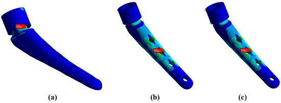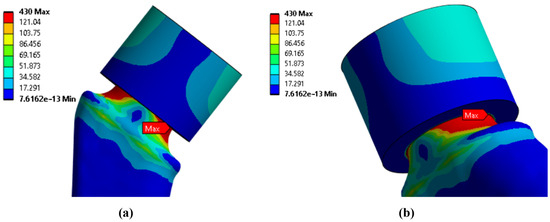 Maximum von Mises stresses for different types of neck support: (a) rigid support—218.6 MPa; (b) elastic support with the Young’s modulus of 12 GPa—249.1 MPa; (c) elastic support with Young’s modulus of 6 GPa—274.9 MPa.