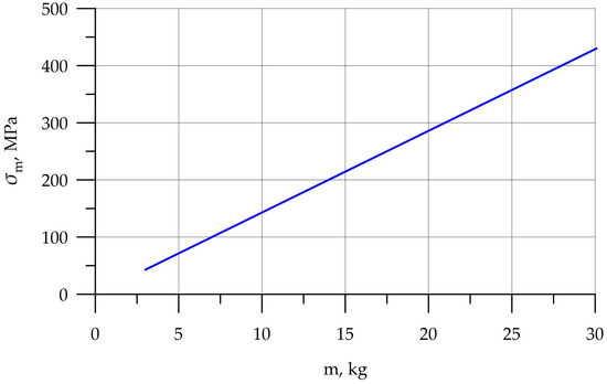 Since the main objective of this work was to study the strength at the fracture sites below the neck, the results for the rigid stem fixation variant are given below. The iterative method was used to select the maximum load on the prosthesis equal to 30.1 kg, at which the maximum von Mises stress value of 430 MPa was achieved, according to the established strength criterion. The stress concentrators were located under the neck. Figure 9 shows the von Mises stress distribution fields, Figure 10 shows a diagram of the dependence of the maximum von Mises stress on the applied mass, and Figure 11 shows the displacements in the model.