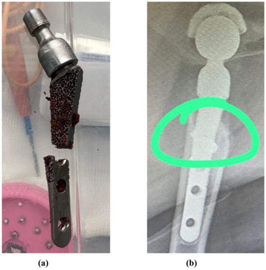 Fractures in the middle part of the stem: (a) case 1, (b) case 2 [63]. The green circle shows the area of destruction.
