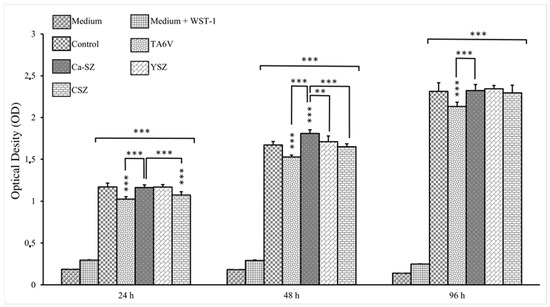 Kinetics of cell viability by WST-1 of Saos-2 cells exposed to CSZ, TA6V, and YSZ biomaterials and Ca-SZ coating compared to different exposure times of 24 h, 48 h, and 96 h. ** for 0.01 ≤ p < 0.05, and finally *** for 0.001 and below ≤ p < 0.01.