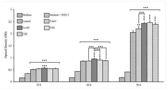 Saos-2 and HaCat cells were seeded in 12-well plates at 40,000 cells/mL at 2 mL per well in the presence of TA6V, CSZ; YSZ, and Ca-SZ discs and controls in an arrangement of N = 3 independent biological replicates for 24 h, 48 h, and 96 h. After each respective exposure time, the medium was aspirated from each well, and the wells were washed twice with 1 mL of SVF-free culture medium. 200 µL (10% of the final well volume) of tetrazolium salt solution (WST-1) (Roche Diagnostics GmbH, Mannheim, Germany) was added to each well containing 2 mL of fresh SVF-free medium, protected from light. The plates were incubated for a further 3 h at 37 °C. A technical triplicate of 170 µL of cell suspension was taken from each well and placed in a new 96-well plate (Sarstedt, Numbercht, Germany). The optical density absorbance was read at 450 nm to quantify the metabolic activity of the cells using a plate reader (FLUOstar Omega, Nancy, France).