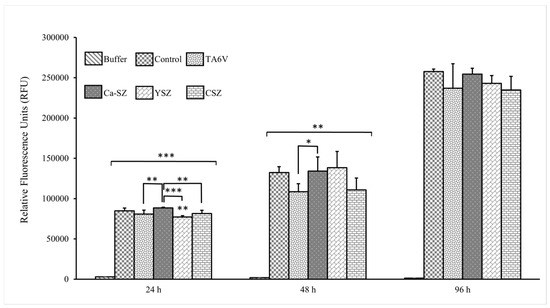 The cell proliferation kinetics of Saos-2 cells grown on Ca-SZ, CSZ, TA6V, and YSZ, compared to the 24 h, 48 h, and 96 h exposure by CyQUANT NF, is presented in Figure 3. Here, the relative fluorescence unit (RFU) is directly proportional to the amount of DNA in the cells, indicating the evolution of the cell number. At 24 h, Saos-2 cells were relatively numerous in the presence of all the biomaterials. RFU values were significant for cells in the presence of the Ca-SZ coating, outperforming the CSZ, TA6V, and YSZ groups. The 48 h exposure time showed an overall significant relative increase in cell proliferation observed for all biomaterials compared to controls. Although cell proliferation in the presence of the Ca-SZ coating was significantly higher than in the TAV6 group, this was similar to the other reference biomaterials. At 96 h, the RFU values increased with the increasing number of cells present, with no significant differences between the biomaterials.