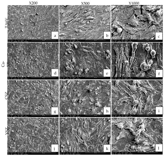 The morphology of Saos-2 cells on TA6V (a–c), CSZ (g–i), YSZ (j–l), and Ca-SZ coating (d–f) surfaces at ×200, ×500, and ×1000 magnification after the 96 h exposure.
