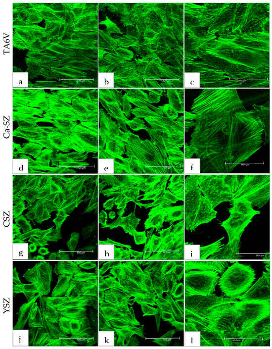 Confocal microscopy analysis of Saos-2 cytoskeletal actin, exposed to the surfaces of TA6V, CSZ, YSZ, and the Ca-SZ coating for 72 h, reveals a dense and cohesive organization of the actin cytoskeleton (Figure 5). The cells exhibit a spreading and adherent morphology, confirming the previous SEM observation, this time with the presence of a dense network of longitudinally oriented actin filaments parallel both to each other and to the surface of their respective substrates. The distribution of the actin network is even more evident at high magnification in TA6V, CSZ, YSZ, and the Ca-SZ coating, with no significant differences between the biomaterials, reflecting the high integrity of the actin cytoskeleton (Figure 5c,f,i,l).