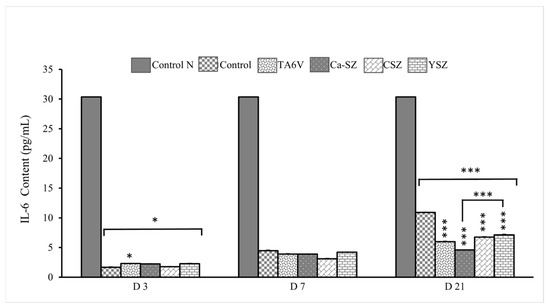 Analysis of IL-6 levels in culture supernatants from Saos-2 cells exposed to TA6V, CSZ, and YSZ biomaterials and the Ca-SZ coating. On D3, the IL-6 level remained low (<5 pg/mL) for all the biomaterials, compared with the normal ‘control N’, which showed a much higher IL-6 concentration of around 30 pg/mL (Figure 6). The TA6V group, nevertheless, showed a significant IL-6 level compared with the control. However, levels on D7 were slightly higher than on D3 for all biomaterials, with no significant difference between them. Conversely, on D21, a slight increase in IL-6 synthesis was observed in cells exposed to the control, TA6V, CSZ, and YSZ groups, although this did not reach the level of the normal control. Importantly, the IL-6 content in cells exposed to the Ca-SZ coating not only remained stable over time between D7 and D21 but was significantly lower than the IL-6 content in cells exposed to all the biomaterials tested, although it was already lower than the normal control. This observation suggests a moderate secretion profile of cells in contact with the Ca-SZ coating, reflecting a minimal early and late inflammatory response to this biomaterial.