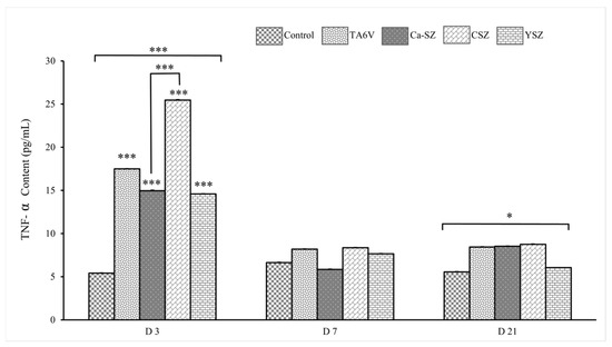 Analysis of TNF-α concentrations in the supernatants of cultures of Saos-2 cells exposed to different biomaterials (TA6V, Ca-SZ, CSZ, and YSZ) shows a significant differential synthesis of TNF-α in all biomaterials on D3 compared with the control group (Figure 7). This observation was particularly pronounced in the CSZ group. Although higher than the control, it should be noted that the level of TNF-α for cells exposed to Ca-SZ and the YSZ group was similar and remained significantly lower compared to other biomaterials. In contrast, the level of TNF-α decreased on day 7 with no significant difference between different biomaterials. This level remained relatively stable until day 21 for all the biomaterials tested, with a significant difference between all the biomaterials. Overall, the concentration of TNF-α on day 3 is the highest for the CSZ group, followed by the TA6V group, while Ca-SZ shows moderate levels at each exposure time, reflecting the most minimal inflammatory response among the biomaterials tested.