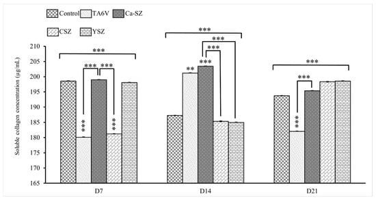 Evolution of soluble collagen concentrations in cell supernatant from TA6V-exposed Saos-2, CSZ, YSZ, and Ca-SZ coatings on days 7, 14, and 21. ** for 0.01 ≤ p < 0.05, and finally *** for 0.001 and below ≤ p < 0.01.