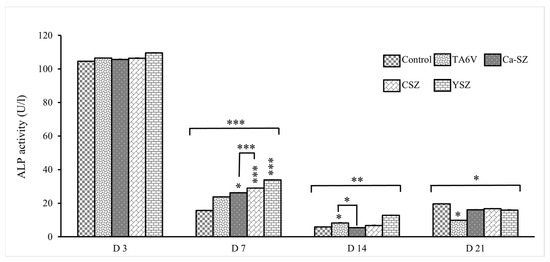Evolution of alkaline phosphatase activity in Saos-2 cells exposed to TA6V, CSZ, YSZ, and Ca-SZ coating on days 3, 7, 14, and 21. * for 0.05 ≤ p < 0.1; ** for 0.01 ≤ p < 0.05, and finally *** for 0.001 and below ≤ p < 0.01.