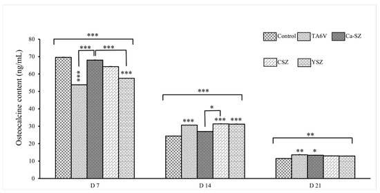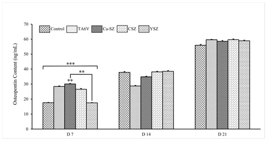 Measurements of osteopontin concentration show a significant dependence on biomaterials and exposure time (Figure 11). On D7, all groups showed significantly elevated osteopontin concentration levels compared to the control. More importantly, the Ca-SZ group showed a significantly dominant osteopontin concentration level compared to the YSZ group. On D14, a moderate increase in osteopontin concentration was observed in all biomaterials. There was a significant increase on D21 of over 60 ng/mL, which was similar for all the biomaterials tested. The data clearly show a progressive increase in osteopontin concentrations over time, suggesting a dynamic cellular response, particularly for Ca-SZ, which shows the highest concentration level on D7, suggesting that this material promotes an early and intense cellular response to osteopontin synthesis compared with the TA6V, CSV, and YSZ groups.
