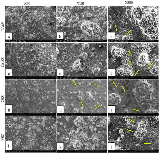 SEM micrographs of hydroxyapatite crystals formed on the surface of TA6V (a–c), CSZ (g–i), YSZ (j–l), and Ca-SZ (d–f) coating after differentiation of Saos-2 cells under osteogenic conditions for 21 days. Yellow arrows indicate fractal formations of hydroxyapatite crystals.