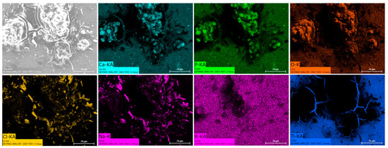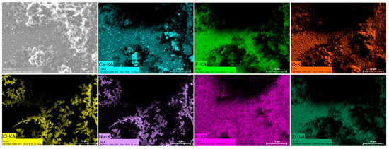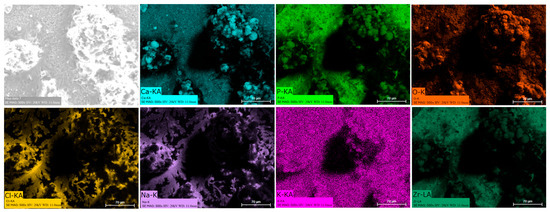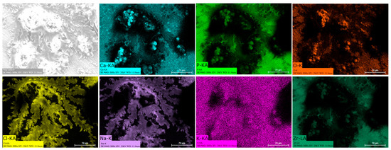 Energy dispersive spectroscopy (EDS) mappings of HA crystals obtained after Saos-2 cell culture exposed to TA6V (Figure 13), CSZ (Figure 14), YSZ (Figure 15), and the Ca-SZ coating (Figure 16) reveal a heterogeneous distribution of chemical elements within the crystalline structures. The main elements making up the HA molecule of formula Ca5(PO4)3(OH) such as calcium (Ca), phosphorus (P), and oxygen (O) have been identified and confirmed, with the exception of hydrogen due to its very low atomic number. However, the presence of traces of sodium (Na) and chlorine (Cl) in the exact position of the branched formations described above and of potassium (K) diffusely throughout the biomaterials should be emphasized.