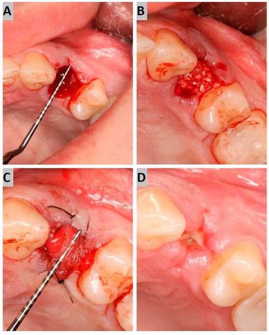 (A) Post-extraction socket; (B) augmentation with a grafting material; (C) collagen membrane suturing; (D) secondary intention wound healing after 7 days.