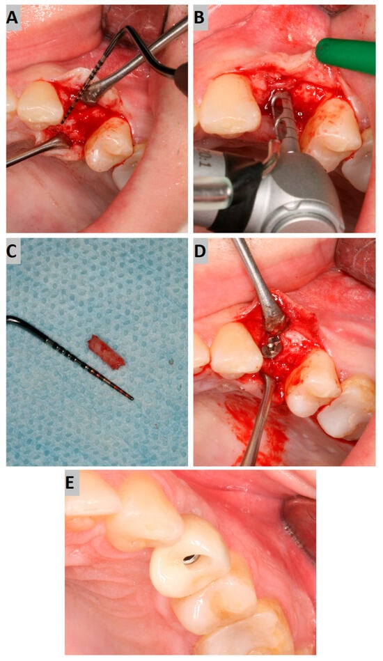 Implant placement was carried out, according to clinical conditions, either flaplessly with the aid of a tissue punch or conventionally with mucoperiosteal flap elevation. During the surgery, a trephine bone biopsy was performed using a trephine with a 2 mm inner diameter (Figure 2B,C). Next, the implant bed was prepared according to the drill sequence, and a dental implant of an adequate length and diameter (AB Dental I5) was placed, obtaining sufficient primary stability (>35 Ncm). Afterward, the cover screw was tightened to the implant, and the submerged healing protocol was employed (Figure 2D).