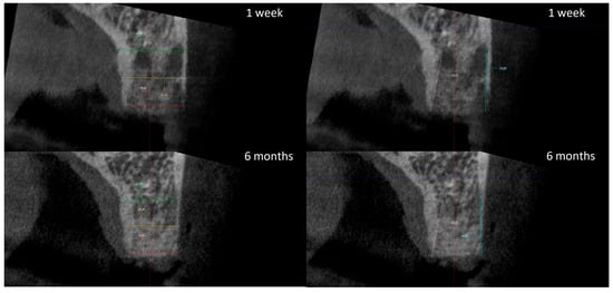 Bone optical density was measured in Hounsfield units (HU) using ImageJ software (version 1.53k, Wayne Rasband and contributors, National Institutes of Health, Kensington, MD, USA). The readings were taken on the horizontal plane in the central part of the alveoli 7 days and 6 months after surgery (Figure 5). If an interradicular septum was present in the central part of the socket, measurements were taken more coronally to reduce the risk of bias.
