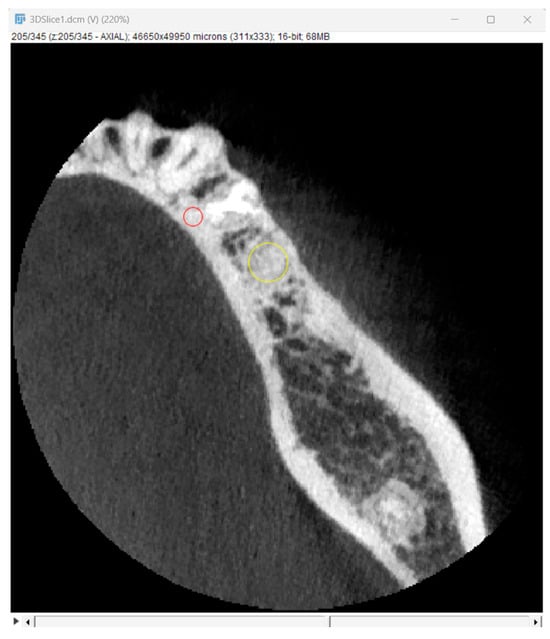Radiographic optical density of bone measured using ImageJ software. The yellow circle represents the ROI where the measurements were taken, and the red circle represents the positioning pin used for orientation during the measurements.