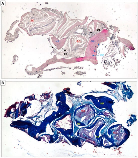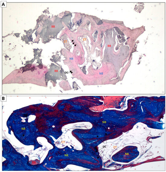 Xenograft group. Two-dimensional (2D) reconstruction of the bone sample at ×40 magnification. (A) Hematoxylin and eosin staining; (B) Masson’s trichrome staining. Woven bone stained blue and lamellar bone stained red. Residual xenograft particles (BO) surrounded by newly formed bone tissue (NB) with osteocytes (OCs, blue arrows). Connective tissue (CTs black arrows) consisting of fibroblasts and adipocytes.