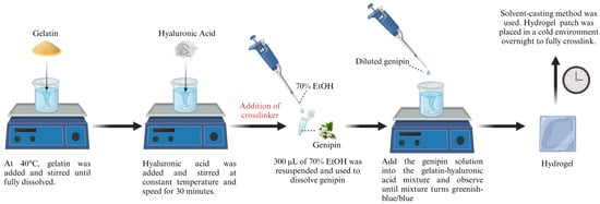 In this study, we propose the use of a simple but effective hydrogel patch as an alternative to current wound healing dressings. Hydrogels are a three-dimensional polymeric network that are known for their ability to retain moisture and good biocompatibility and biodegradability while also ensuring the delivery and controlled release of active components []. The main polymers used for this hydrogel patch are all-natural based, consisting of gelatin, hyaluronic acid, and genipin.