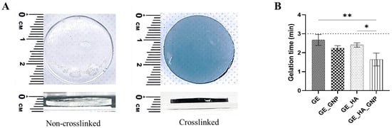 (A) Gross appearance (top and lateral views) of non-crosslinked (GE) and crosslinked (GE_GNP) hydrogels and (B) the gelation time for each group, where * indicates a significance of p < 0.05 and ** indicates a significance of p < 0.01.