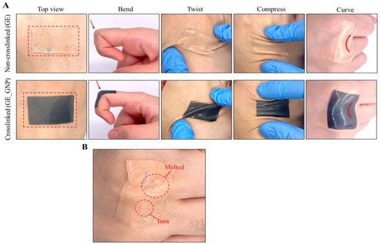 Furthermore, the adhesive properties of the hydrogel patches were also evaluated to determine their ability to conform to any parts of the skin under various external stimuli, including the bending, compressing, twisting, and curvature of the hydrogel. Surprisingly, during the fabrication process of the hydrogel patch, it was discovered that hydrogels with a thickness of more than 2 mm were neither as adhesive nor as stretchable. This finding was then later supported by a study, stating that thinner hydrogels store less elastic energy, which allows the hydrogel to stretch more freely []. Additionally, elasto-capillary effects also play a crucial role in thin and soft hydrogels due to their ability to maintain stable surfaces and strong adhesion by increasing surface tension forces. This can be compared to thicker hydrogels that experience higher elasto-capillary lengths, often leading to a wrinklier and creasing appearance, as well as a reduction in adhesive performance [,]. As observed in Figure 3A, we provide a comparison of the GE (non-crosslinked) and GE_GNP (crosslinked) hydrogel patches applied to the skin, showing that they adhered well onto the skin while following the bending and curving of the skin. However, as shown in Figure 3B, the non-crosslinked (GE) hydrogel showed noticeable melting and tearing of the hydrogel after 2 min on the skin (body temperature: 37 °C). It also underwent poor degradation and durability and exhibited weak mechanical stability, as it deformed easily under stress. In contrast, crosslinked hydrogels were able to withstand the body temperature for a long period due to the formation of covalent bonds enhancing the three-dimensional network and mechanical properties [].