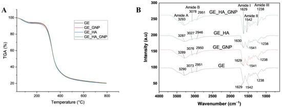 Focusing on the chemical characterization of the hydrogel patches, TGA and FTIR were analysed. TGA was conducted to provide insight into the thermal stability and degradation behaviour of the hydrogel patches, mainly focusing on mass loss and thermal degradation peaks. Based on Figure 4A, during the first phase of the initial moisture loss, all of the hydrogel patch groups exhibited similar initial mass loss, with that in GE and GE_HA occurring at 83 to 86 °C, with a mass loss of 5.8 and 7.1%. GE_GNP and GE_HA_GNP exhibited a slightly lower water loss between 83 to 90 °C, with a mass loss of 6.2 to 6.5%. During the second phase of polymer breakdown, GE_GNP and GE_HA_GNP exhibited higher degradation temperatures between 328 to 330 °C, with a mass loss of 73.4 and 73.2%. This may indicate that with the addition of genipin, the thermal stability slightly increased. However, GE and GE_HA exhibited lower degradation temperatures of 325 to 329 °C, with a mass loss of 74 and 73%. The mass loss during the third phase of the major decomposition of all hydrogels was similar.