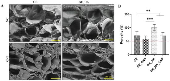 The microstructure of the patches was observed using SEM analysis, as shown in Figure 5A, showing the cross-sectional view of the different hydrogel patches at 100× magnification. It can be seen that the non-crosslinked patches (GE and GE_HA) appear to have larger, well-developed pore sizes, that are loosely arranged. This is evident in Figure 5B, in which the porosity percentage, determined using the liquid displacement method, was higher in GE_HA, followed by GE, compared to GE_HA_GNP and GE_GNP. The crosslinked hydrogels (GE_GNP and GE_HA_GNP), on the other hand, show a significant reduction in pore size, with them being denser and more compact, likely due to the formation of additional crosslinks between polymer chains inducing an increase in network compactness [].
