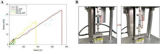 (A) Tensile stress–strain curves of all hydrogel groups (GE, GE_GNP, GE_HA, and GE_HA_GNP). (B) A before and after diagram of the tensile test using a universal tensile machine, where the red arrows indicate the elongation of the hydrogel samples, illustrating their deformation under tensile loading.