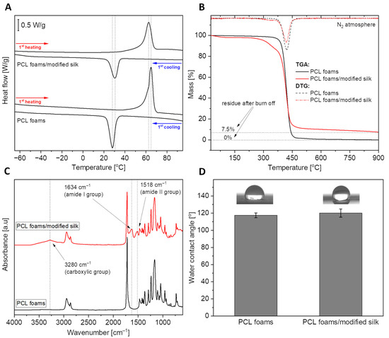 Physicochemical characteristics of PCL foams and PCL foams/modified silk scaffolds: (A). First heating/cooling DSC curves, (B) thermogravimetric curves with their first derivatives (DTG), (C) normalized FTIR spectra; dashed lines indicating distinct bands originating from the silk fraction, and (D) comparison of water contact angle values.