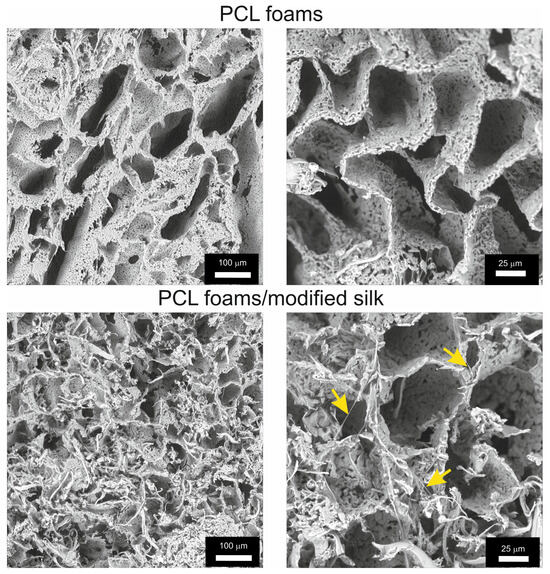 The microstructure of PCL foams and PCL foams/modified silk. Silk fibers are marked with yellow arrows.