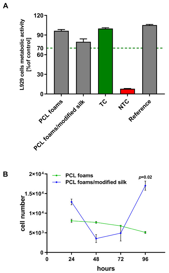 Cytocompatibility is considered to be one of the most important requirements of materials used in biomedical applications. Thus, the 24 h MTT reduction assay was performed to evaluate the initial cellular attachment and metabolic activity of L929 fibroblasts incubated with the biocomposites, in accordance with ISO 10993-5:2009 [43] recommendations, rather than to assess long-term viability. As shown in Figure 3A, the viability of murine fibroblasts exposed to PCL foams and PCL foams/modified silk reached 96.6% ± 1.9% and 79.8% ± 4.3%, respectively.