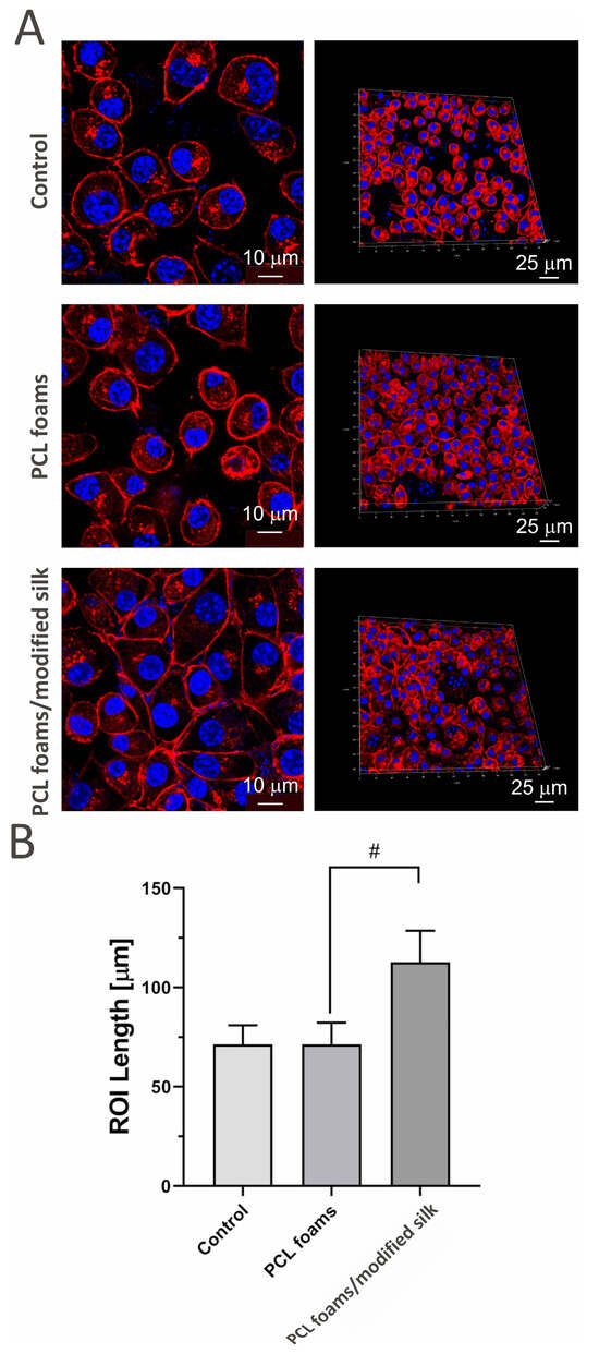 The morphology (A) and average size (B) of L929 (mouse skin fibroblast cells) after 96 h of incubation with tested PCL foams and PCL foams/modified silk, as compared to control cells grown directly on microscope slides. Confocal microscopy visualized cellular structures using DAPI (nuclei; blue) and Texas Red™ Phalloidin (F-actin filaments; red) staining. Scale bars indicate 10 µm (2D images) and 25 µm (3D reconstructions). The results represent the mean values ± SEM of three separate experiments. # p < 0.05 between the PCL and PCL foams/modified silk, based on the results of a one-way ANOVA (Kruskal–Wallis test) evaluation. The figure shows that PCL foams/modified silk enhanced fibroblast adhesion and altered cell morphology, promoting more elongated and spread cells compared to PCL foams and control surfaces.