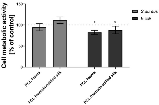 The antimicrobial properties after 24 h incubation with tested compounds (PCL foams and PCL foams/modified silk) against S. aureus or E. coli. The results represent the mean values ± SEM of three separate experiments. * p < 0.05 of the PCL and PCL-modified composites in relation to non-treated samples (100% viability of bacterial cells), based on the results of a one-way ANOVA (Kruskal–Wallis test) evaluation. The figure shows that both PCL foams and PCL foams/modified silk reduced E. coli metabolic activity, while no significant effect was observed against S. aureus after 24 h.