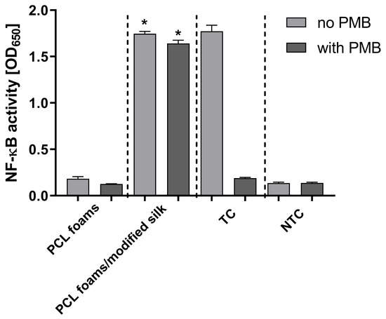 We used THP1-Blue NF-κB human monocytes, carrying an NF-κB-inducible SEAP reporter construct, to explore the potential activation of the NF-κB signal transduction pathway via tested PCL materials. The PCL foams/modified silk induced NF-κB activation up to the level induced by LPS E. coli (treated control), and it was significantly higher (p < 0.05) as compared to PCL foams (Figure 6). However, the addition of polymyxin B (PMB), an inhibitor of LPS, had no effect on PCL foams/modified silk scaffolds-induced changes in the secretion of embryonic alkaline phosphatase (SEAP) but completely inhibited the LPS-induced increases in SEAP production.